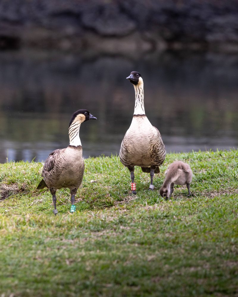 The nēnē is listed as threatened and is especially vulnerable during nesting season, which runs from September through May. During this time, nēnē are frequently seen on or near park roads, increasing the risk of vehicle collisions and negative interactions with visitors.