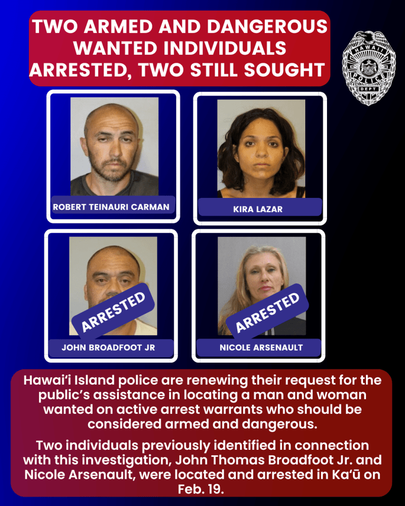 Two individuals previously identified in connection with this investigation, John Thomas Broadfoot Jr. and Nicole Arsenault, were located and arrested in Kaʻū on the morning of Feb. 19. Both have since been released after posting bail.