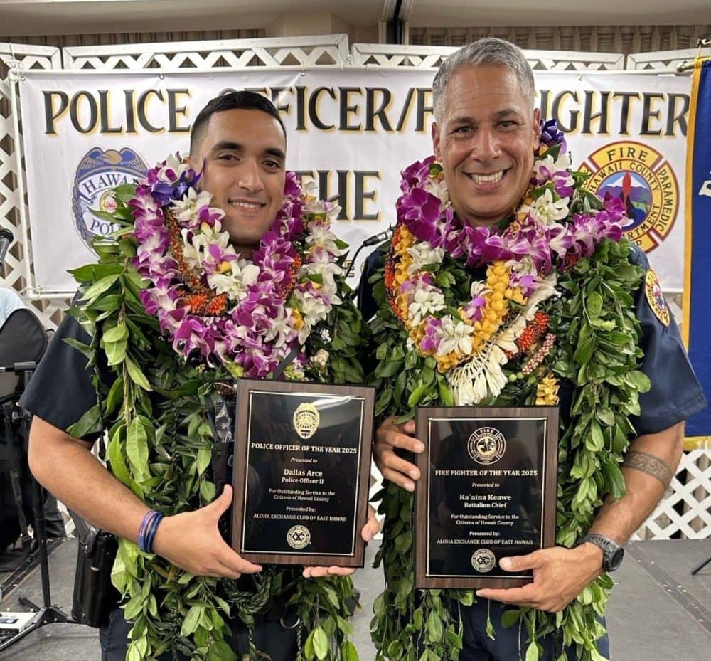The Aloha Exchange Club of East Hawaiʻi recently recognized Hawaiʻi County Police Department (HPD) Puna Patrol Officer Dallas Arce as 2025 Officer of the Year and Hawaiʻi Fire Department (HFD) Battalion Chief Ka‘aina Keawe as 2025.